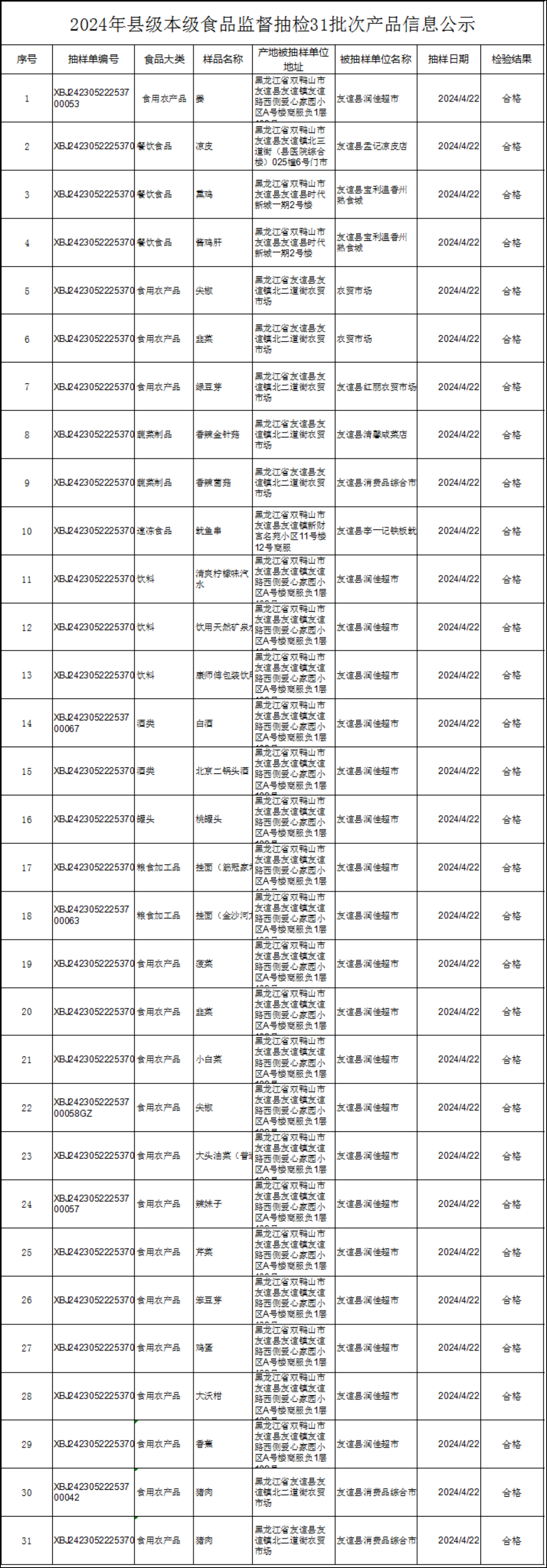 2024年县级本级食品监督抽检31批次产品信息公示