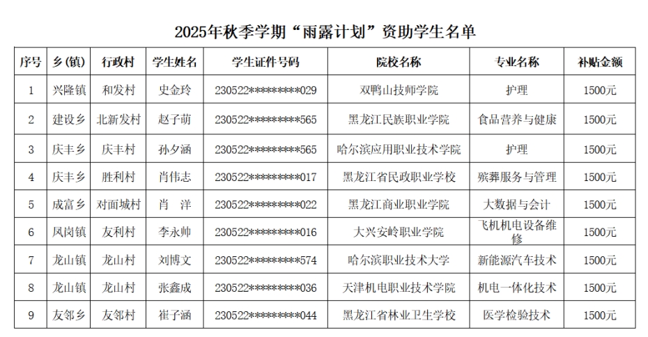 依据黑龙江省农业农村厅《关于组织实施2025年秋季学期雨露计划助学补助等工作的通知》(黑农厅函〔2025〕2710号)文件精神,就读于中、高职业院校(全日制)我县脱贫户家庭学生经本人申请、学校证明、资格审核和村内公示等工作环节后确定符合资助条件的共计9人,获得资助的学生名单详见附表,每学期每名学生将获得职业教育专项资助1500元。另依据有关文件要求对在互联网上公告的学生身份证号码信息采取脱敏措施。