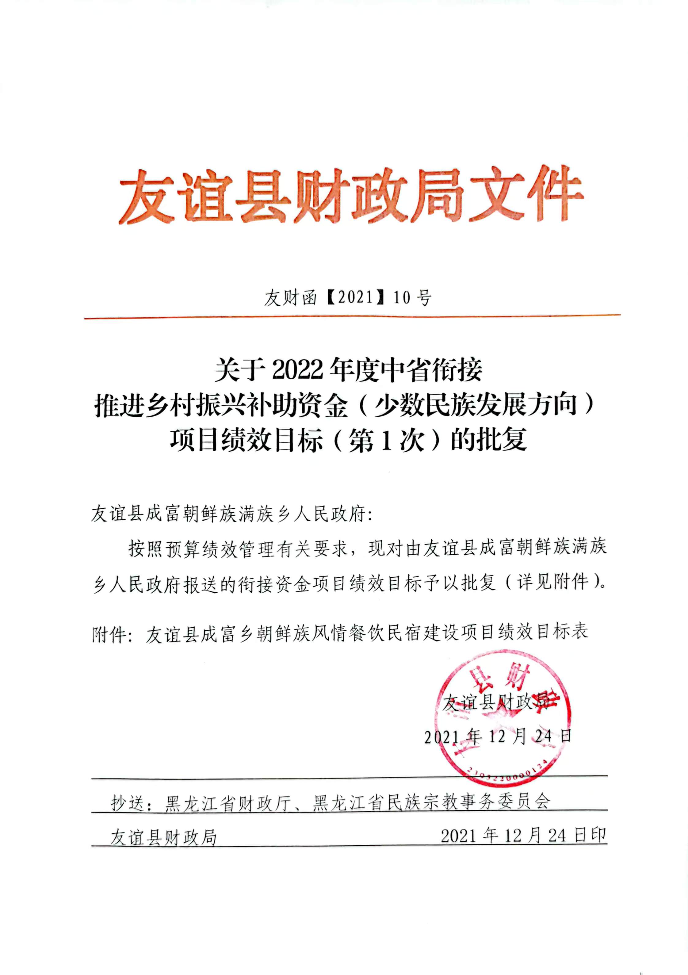 友谊县财政局《关于2022年度中省衔接推进级村振兴补助资金(少数民族发展方面)项目绩效目标(第1次)的批复》(友财函[2021]10号)