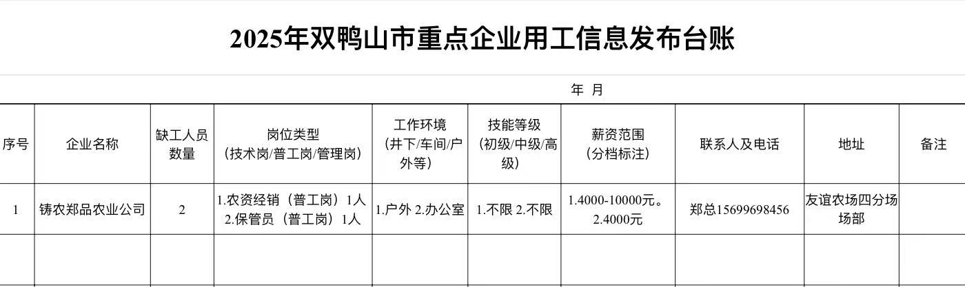友谊县人社局关于2025年双鸭山市重点企业用工信息的公示