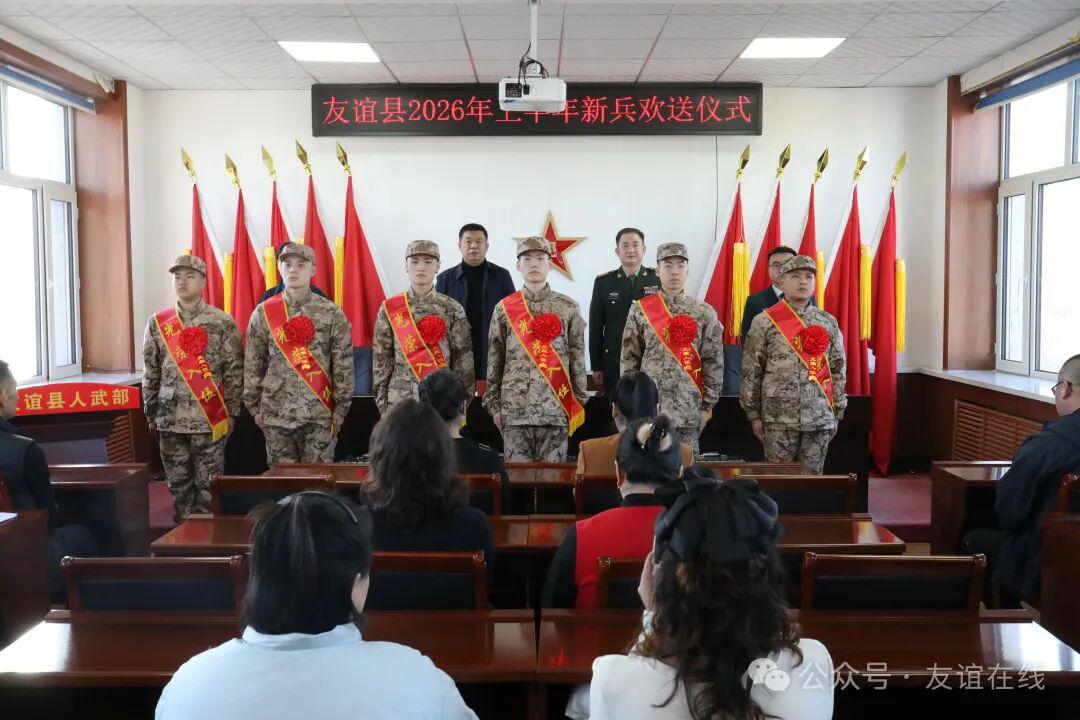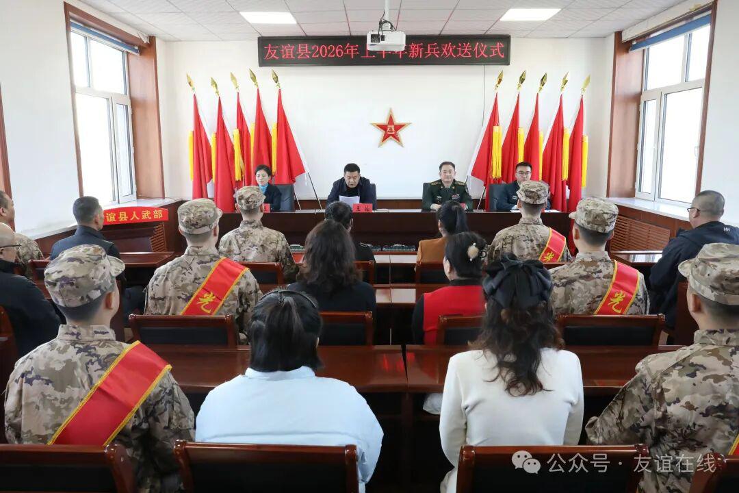 3月15日,友谊县人武部在友谊县民兵训练基地举行了2026年上半年新兵入伍欢送仪式,为即将奔赴军营、献身国防的优秀青年送行,激励广大新兵牢记使命、不负重托,在军营淬火成钢、建功立业。相关县领导及相关单位负责同志、新兵家属参加活动。