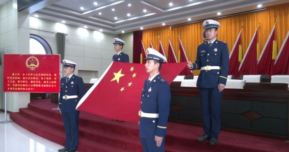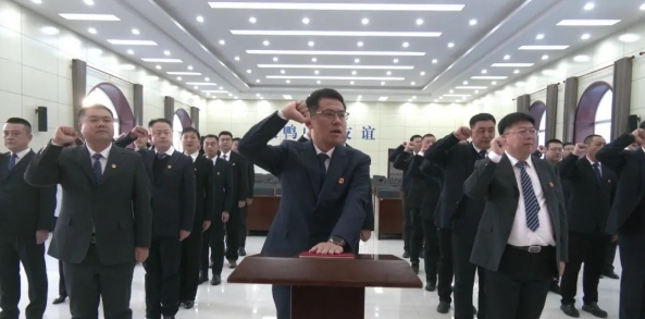 国歌奏唱,全场肃立。全体宣誓人员面对鲜艳的五星红旗,举起右拳,庄严宣誓:“我宣誓:忠于中华人民共和国宪法,维护宪法权威,履行法定职责,忠于祖国、忠于人民,恪尽职守、廉洁奉公,接受人民监督,为建设富强民主文明和谐美丽的社会主义现代化强国努力奋斗!”
